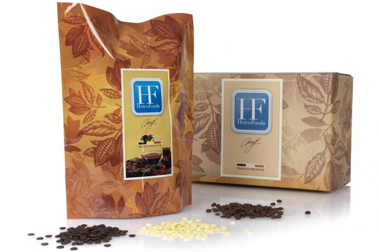 Our exclusive 1kg packaging is specifically developed for foodservice, retail, online sales and homebaking. The nicely designed bags have a resealing strip to enable easy and perfect closure after using the chocolate. For this packing we use chocolate in 2cm button chips (little bigger than callets and drops), as this is a perfect ‘bite-size’ for snacking while still keeping its excellent easy melt properties. Our Herco HERCO® chocolates are made from carefully selected cocoa beans, contain only natural ingredients and are highly appreciated by chefs, chocolatemakers and consumers all over the world.