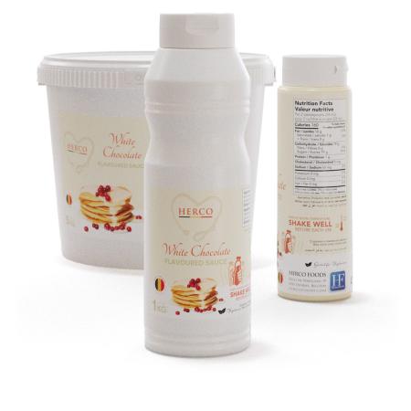 A ready to use sauce with a delicious white chocolate taste. Our HERCO® white chocolate flavoured sauce is an high-end, top quality sauce for ice creams, desserts, hot drinks and cocktails. It has a creamy white color and the sublime taste of the well known Belgian chocolate. Ideal to add the Belgian chocolate tradition into your dessert or drink.